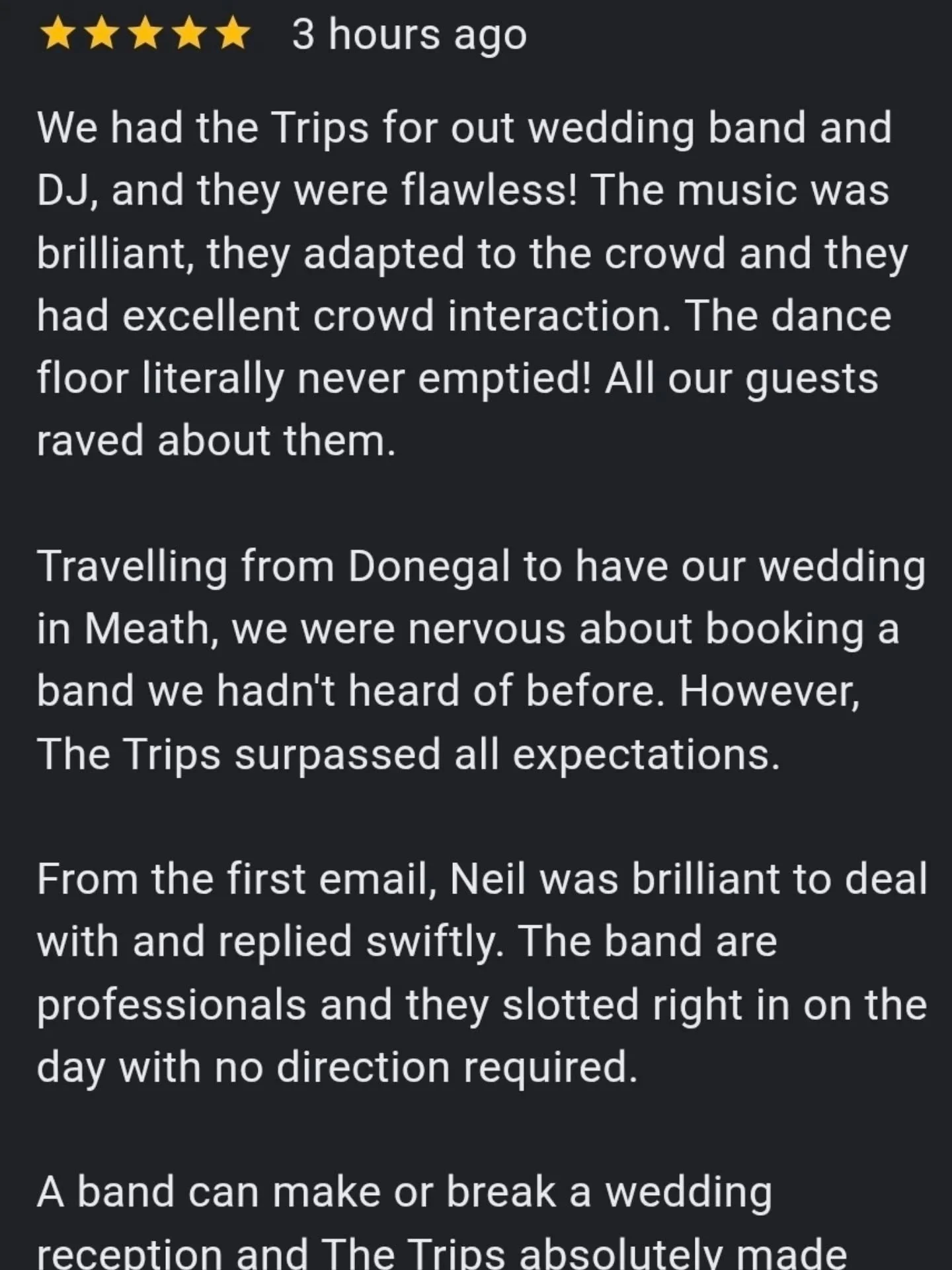 “Myself and my husband had the best time with the Trips as our wedding band. They had the dancefloor full from the first song until the end of the night. I recommend the additional DJ set.